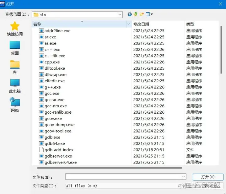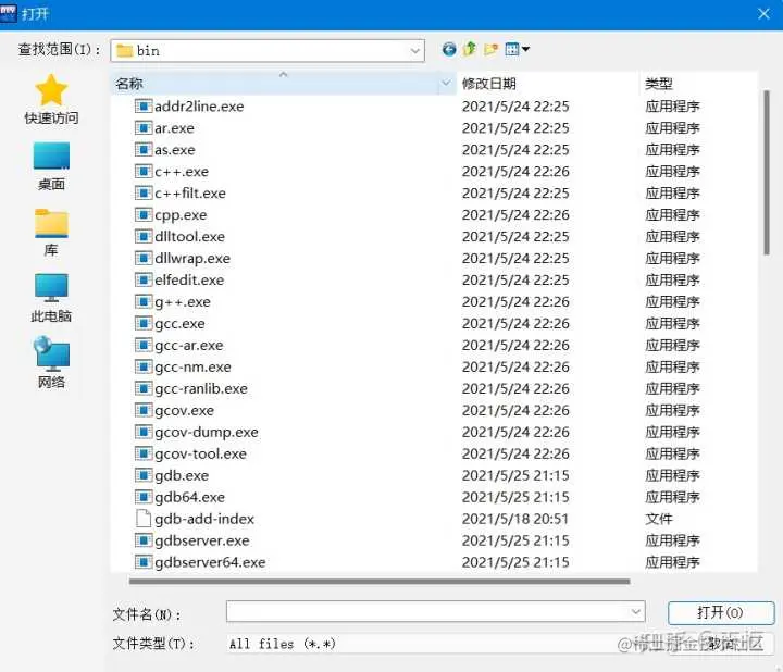 我们点击左边那个文件按钮,访问你安装路径下 TDM-GCC-64下的bin文件夹里,你会看到一系列exe文件:
