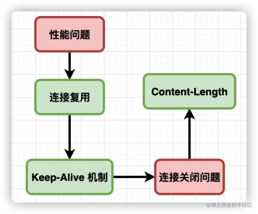 上图是 1.0 版本带来的解决问题, 可以说解决性能问题, 连接复用是很有必要的. 因此到了 HTTP1.1 连接复用就变成了一个默认属性, 即使不加上 Connection: Keep-Alive 属性, 服务器也会在请求处理完毕之后不关闭连接. 除非显式的加上 Connection: close