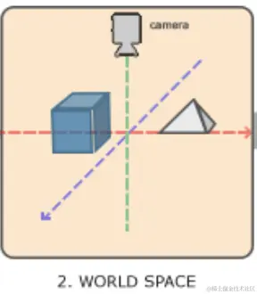 在各物体的局部坐标设置后,实际世界中的物体是分散放在不同地方的,如下图所示,正方体和三棱锥分别放到了不同不同的位置,这个时候二者之间才有了相互间的位置关系。