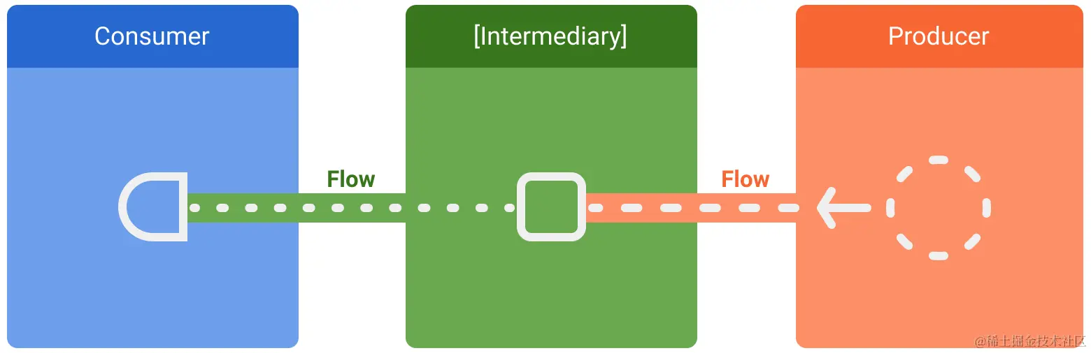 Kotlin Flow 包含三个实体:数据生产方 - (可选的)中介者 - 数据使用方。数据生产方负责向数据流发射(emit)数据,而数据使用方从数据流中消费数据。根据生产方产生数据的时机,可以将 Kotlin Flow 分为冷流和热流两种: