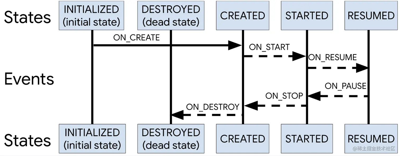 State一共有:DESTROYED、CREATED、STARTED、RESUMED和INITIALIZED;