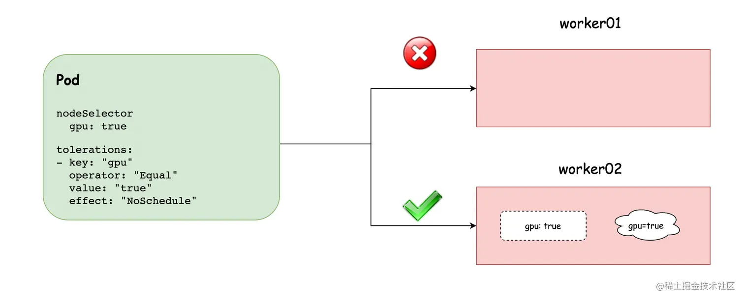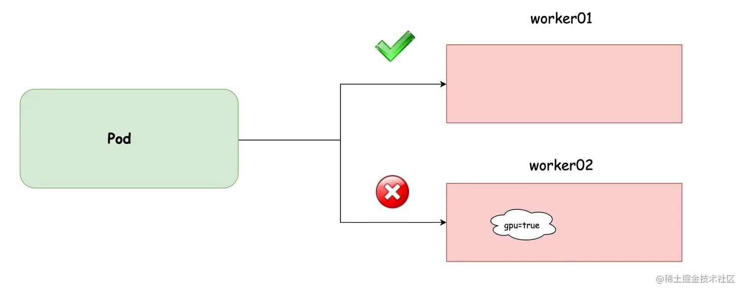 正常你创建的 Pod,没有进行特殊的配置,是无法调度到 worker02 的,只能调度到 worker01,即使你使用了 nodeSelector