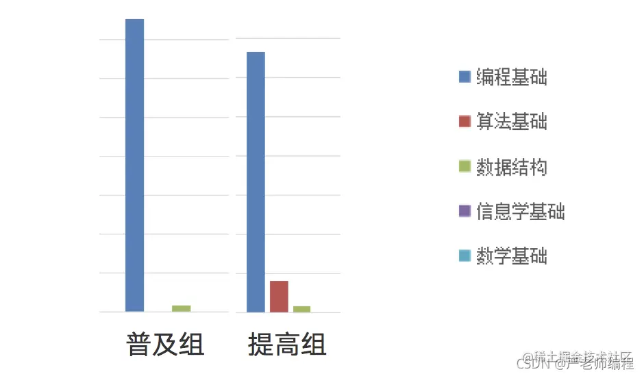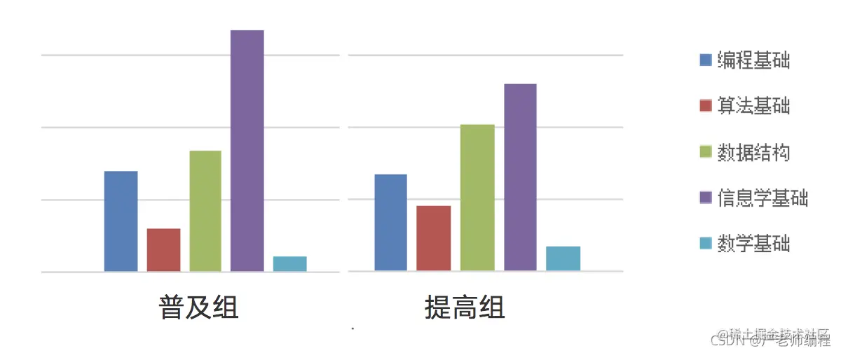 提高组算法和数据结构的占比明显提升,信息学基础略有下降,表示了在通过普及组的基础上,提高组对信奥核心考点(算法,数据结构)更高的要求。