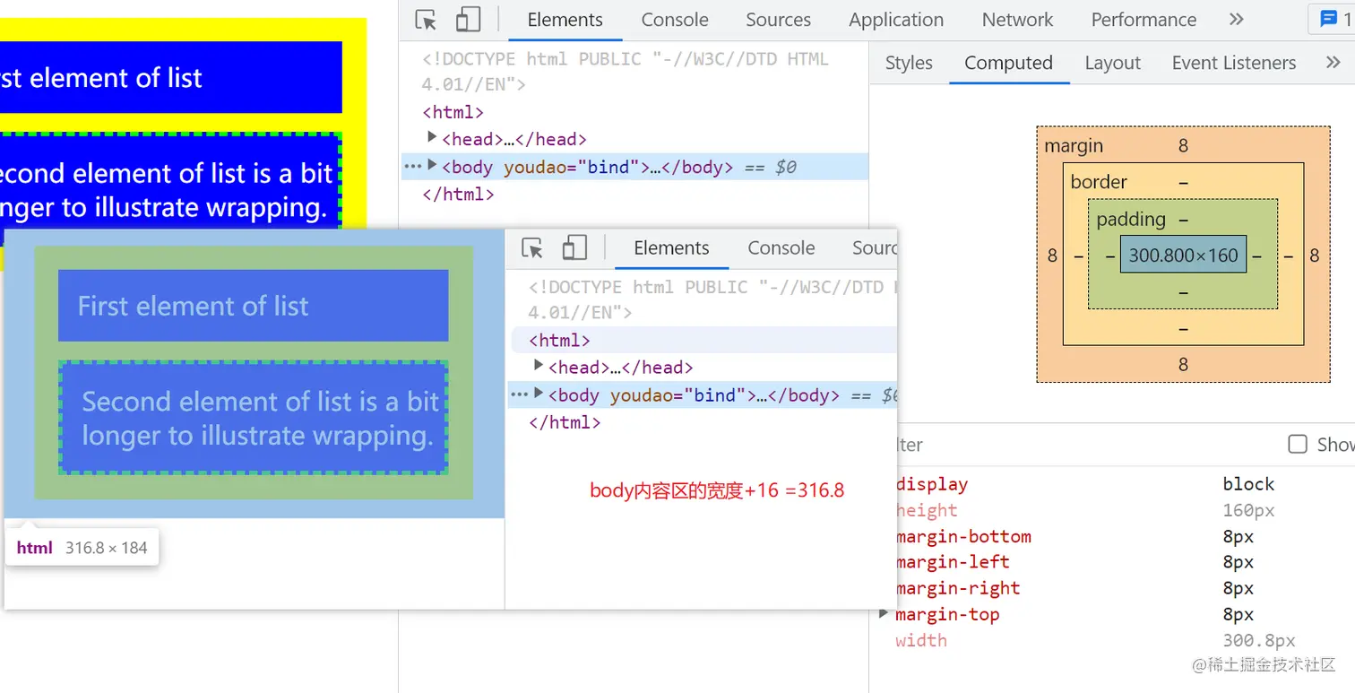 body元素的margin box的宽度 = 它的包含块(html元素)的内容区的宽度得到: body的宽度 = 316.8-16 = 300.8