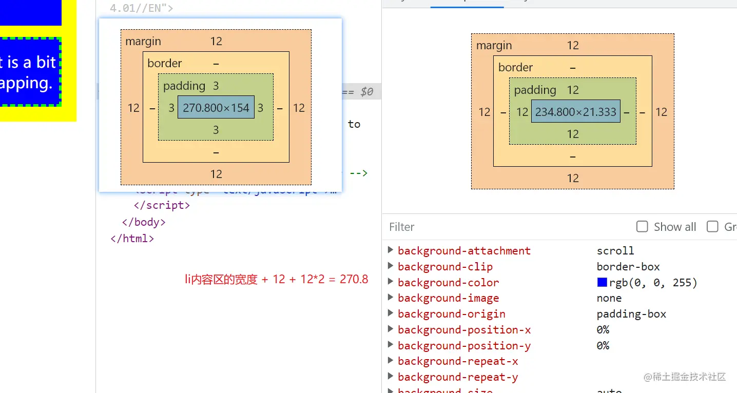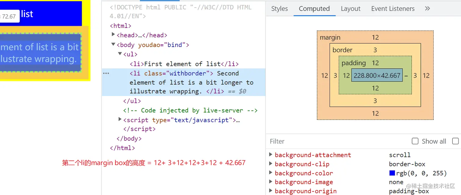 第一个li的margin box的高度 = 12 + 12 + 21.333 + 12 + 12 = 69.333第二个li的高度 = 12 + 3+ 12 + 12 + 3+ 12 + 42.667 = 96.667