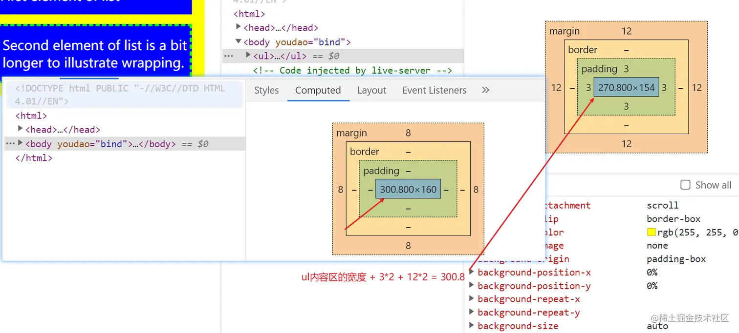 li盒子的margin box高度取决于li元素内容区的高度+上下padding+上下border+上下margin. 注意, 两个li盒子垂直方向的margin合并了 li盒子的右padding设置为0, 效果见第二张图li盒子的margin是透明的--margins永远是透明的--因此, ul的填充, 内容区的背景颜色(黄色)穿透了它们(li的margin)- 第二个