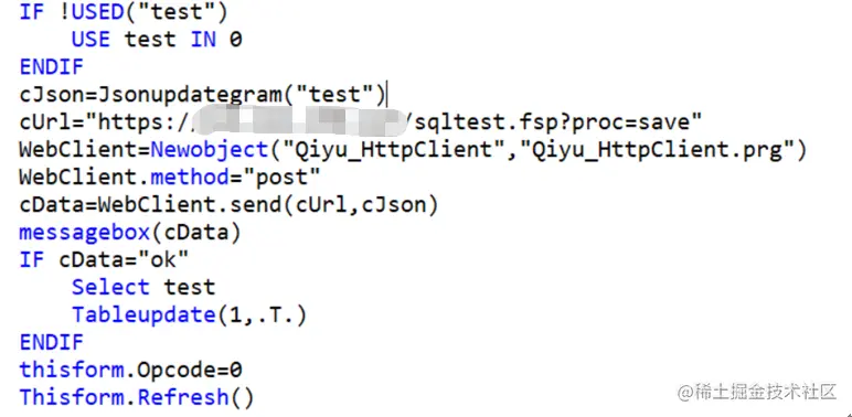 - 按保存按钮,通过JsonUpdateGram(cursor)生成只带变更数据的JSON,然后通过Qiyu_HttpClient将此JSON传给中间层的sqltest类中的save方法,完成保存。大家可以看到整个过程没有出现sql语句,也没数据连接,也没有事务,因为这些都已被猫框封装了,是不是简单很多。嗯,其实这一切都是得益于猫框的Qiyu_HttpClient、QiyuJsonReader、JsonUpdateGram、dal_ca的功能强大,实现了前端和后端的无缝对接,让JSON飞来飞去就完成了数据保存。