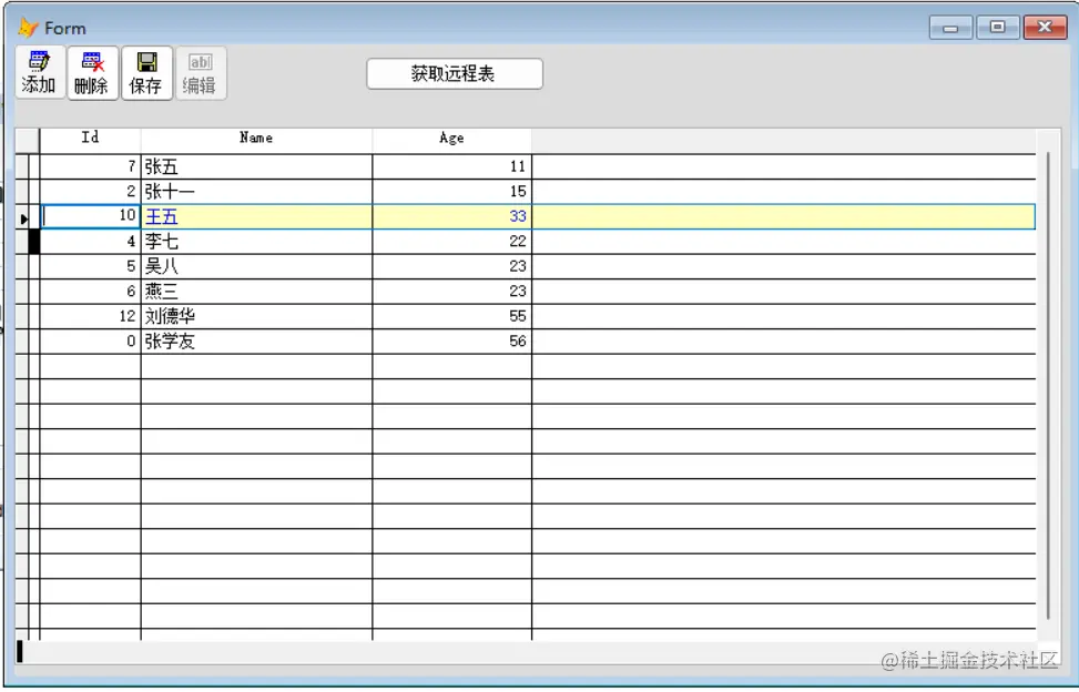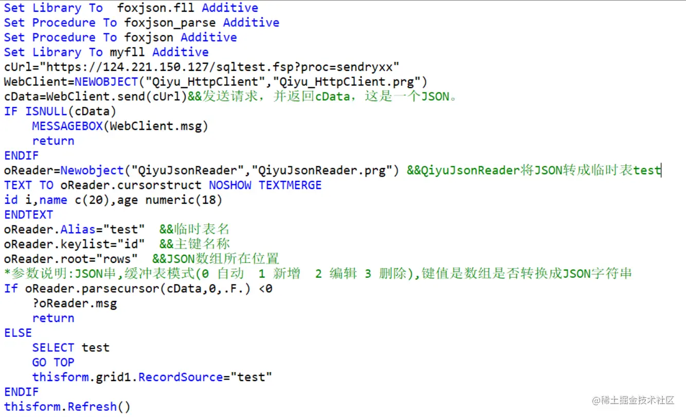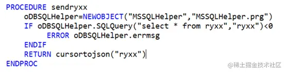 - 前端通过Qiyu_HttpClient将数据请求发送给中间层的sqltest类中的sendryxx方法(可以带参数查询),然后由sendryxx方法访问后端MSSQL,并取得ryxx表转成JSON返回给前端。接着前端通过QiyuJsonReader将返回的JSON转成有缓冲模式的临时表CURSOR,并通过grid1显示出来。