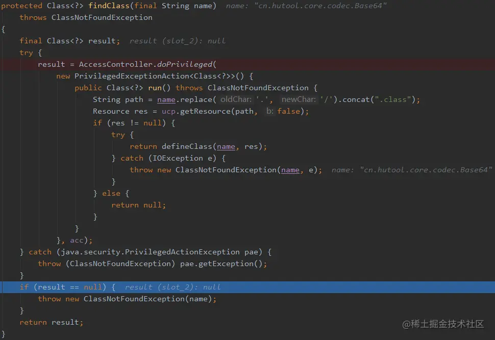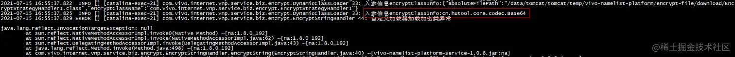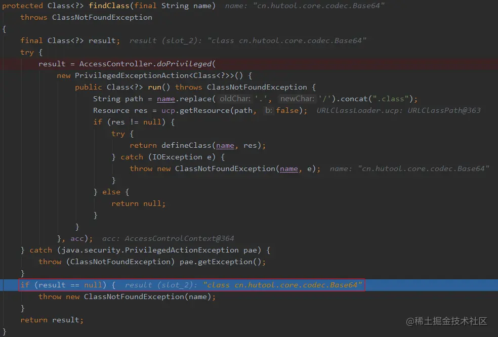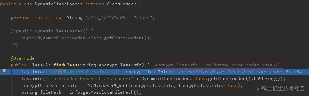 发现这里除了我们需要的正确的入参(第一个入参信息打印)外,还多了一个Base64的全路径名cn.hutool.core.codec.Base64。出现这种情况,说明由于我们重写了ClassLoader的findClass方法,而Base64加载的时候会调用原始的ClassLoader类的loadClass方法去加载,并且里面调用了findClass方法,由于findClass已经被重写,所以就会报上面的json解析错误。