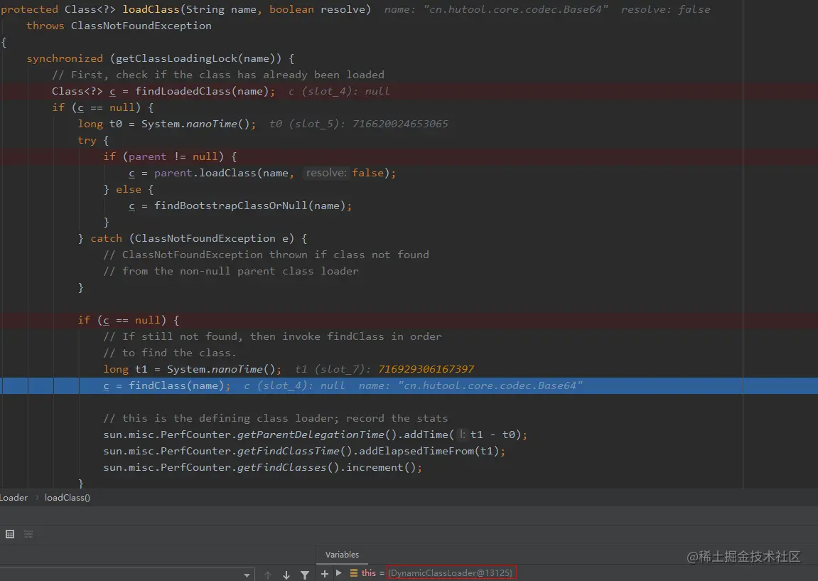 发现加载.class文件的类加载器为自定义类加载器DynamicClassLoader,并且.class加载器的父类加载器为应用类加载器AppClassLoader,加载cn.hutool.core.codec.Base64的类加载器也是AppClassLoader。