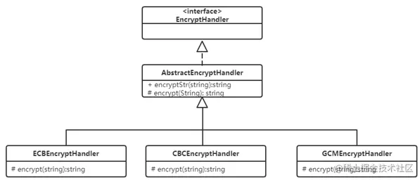 名单管理系统是手机上各个模块将需要管控的应用配置到文件中,然后下发到手机上进行应用管控的系统,比如各个应用的耗电量管控;各个模块的管控应用文件考虑到安全问题,有自己的不同的加密方式,按照以往的经验,我们可以利用模板方法+工厂模式来根据模块的类型来获取到不同的加密方法。代码类层次结构示意如下: