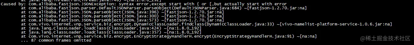 json解析逻辑主要存在于DynamicClassLoader#findClass方法入口处的将字符串转换为对象逻辑,为什么这里会报错,我们在入口处打印了入参。