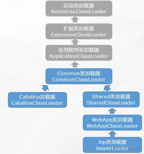 为此,tomcat扩展出了Common类加载器(CommonClassLoader)、Catalina类加载器(CatalinaClassLoader)、Shared类加载器(SharedClassLoader)和WebApp类加载器(WebAppClassLoader),他们分别加载/commons/、/server/、/shared/*和/WebApp/WEB-INF/*中的Java类库的逻辑。