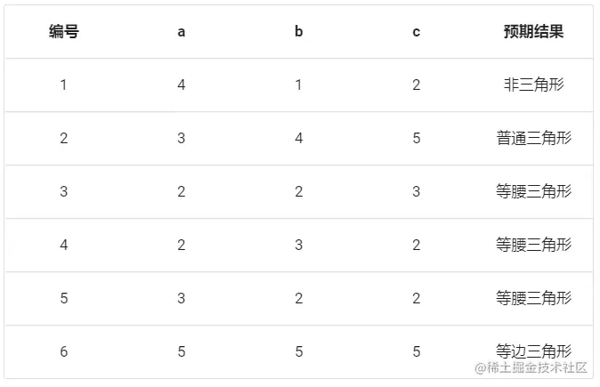 设计测试用例 设计测试用例时不可能的情况可以排除,非三角形的情况需要考虑每个值取值的不同情况。得出最后的测试用例如下表所示: