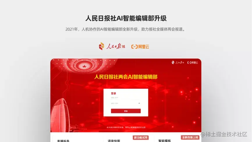 AI 编辑部 2.0 发布以来,人民日报技术部联合阿里云视频云,应用该能力于两会的内容生产,采用阿里云的 AI 技术,经过人民日报的海量数据训练,结合人民日报的业务场景进行 AI 应用创新。AI 编辑部 “会看、会听、会悟、会查”,可实现各类新媒体产品的自动化、批量化、智能化生产,实现多模态检索、智能清除、智能视频制作等功能,极大提升新闻生产效率,全面助力人民日报两会报道。经过不断的迭代和完善,在 2021 年的两会前夕,阿里云视频云针对人民日报社的 AI 智能编辑部,进行功能的全面上新升级,融合五大全新 AI 能力,助力报社全媒体两会报道提质增效。