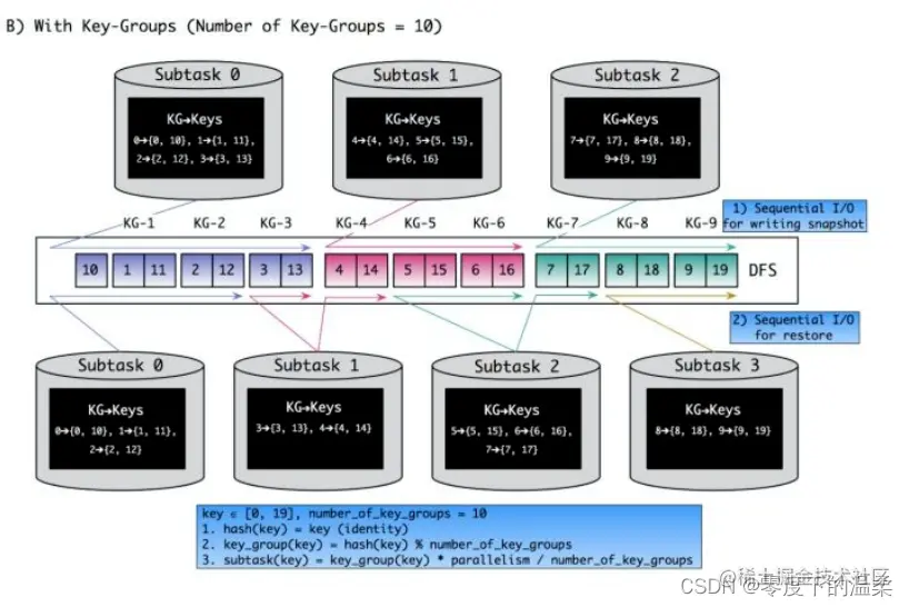 - 并行度变化时:keyed-state 的重新划分是随着 key-group 进行的。其中 key-group 的个数就是最大并发度的个数。其中一个 key-group 处理一段区间 key 的数据,不同 key-group 处理的 key 是完全不同的。当任务并行度变化时,会将 key-group 重新划分到算子不同的 sub-task 上,任务启动后,任务数据在做 keyby 进行数据 shuffle 时,依然能够按照当前数据的 key 发到下游能够处理这个 key 的 key-group 中进行处理,如下图所示。注意:最大并行度和 key-group 的个数绑定,所以如果想恢复任务 state,最大并行度是不能修改的。大家需要提前预估最大并行度个数。