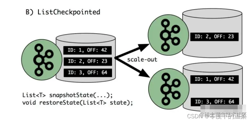 - a. ListState:均匀划分到算子的每个 sub-task 上,比如 Flink Kafka Source 中就使用了 ListState 存储消费 Kafka 的 offset,其 rescale 如下图