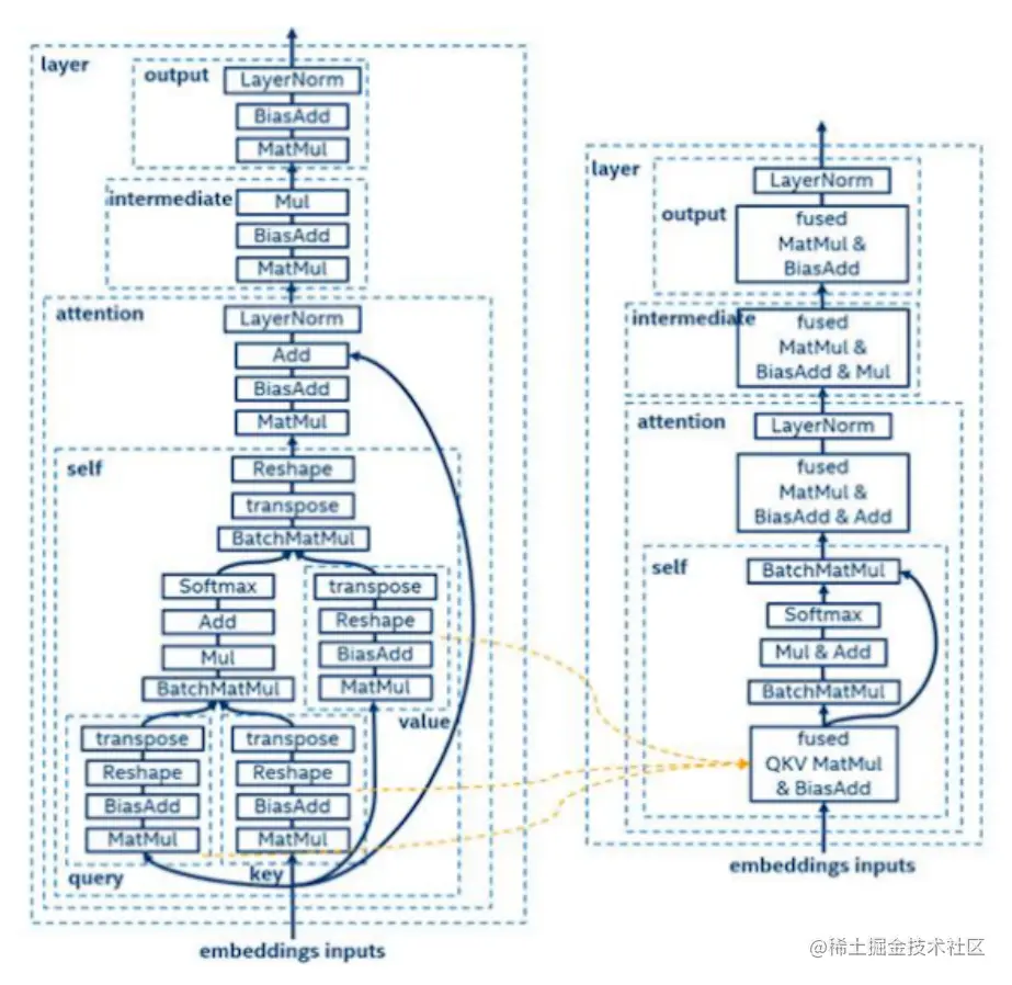 在 TensorFlow 中,“前端”负责图描述,“后端”负责算子的执行。因此,我们可以将模型从原始 BERT 模型转换为前端带有 BERT op 的新模型,并将新的 BERT 内核实现注册到后端。因此,我们不需要重新安装 TensorFlow 框架。我们只需要加载实现 BERT 代码的动态库即可,并通过 oneAPI 深度神经网络库 (oneDNN)等高性能工具,来提升性能。