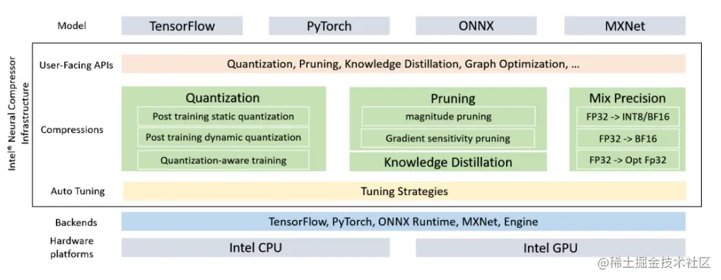 INC全称为Intel® Neural Compressor,是一个运行在Intel CPU和GPU上的开源Python 库,它为流行的网络压缩技术 (如量化、剪枝、知识蒸馏) 提供跨多个深度学习框架的统一接口。