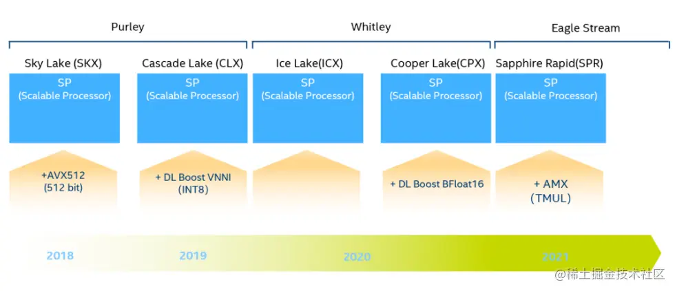 自 Skylake 以来,英特尔通过从 AVX256 升级到 AVX512,将 AVX 的能力提高了一倍,这极大地提高了深度学习训练和推理能力。一年后,在 Cascade Lake 中引入 DL Boost VNNI,大大提高 INT8 乘加吞吐量。自 Cooper Lake 之后,英特尔将BFloat16(BF16) 添加到 DL Boost 指令集中,以进一步提高深度学习训练和推理性能。硬件一直在向前发展,AMX 自 Sapphire Rapids 开始推出,将会进一步提高 VNNI 和 BF16 从 1 维-向量到 2 维-矩阵的能力。英特尔可扩展处理器通过英特尔