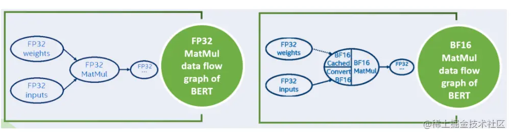 为了减少内存访问,我们将 FP32 权重转换为 BF16 权重,像下图中右边的图结构所示。我们将 FP32 权重转换为 BF16 权重并将 BF16 权重缓存在 BF16 MatMul op 中以供重用,并在每次执行时并行的将 FP32 输入转换为 BF16 输入。