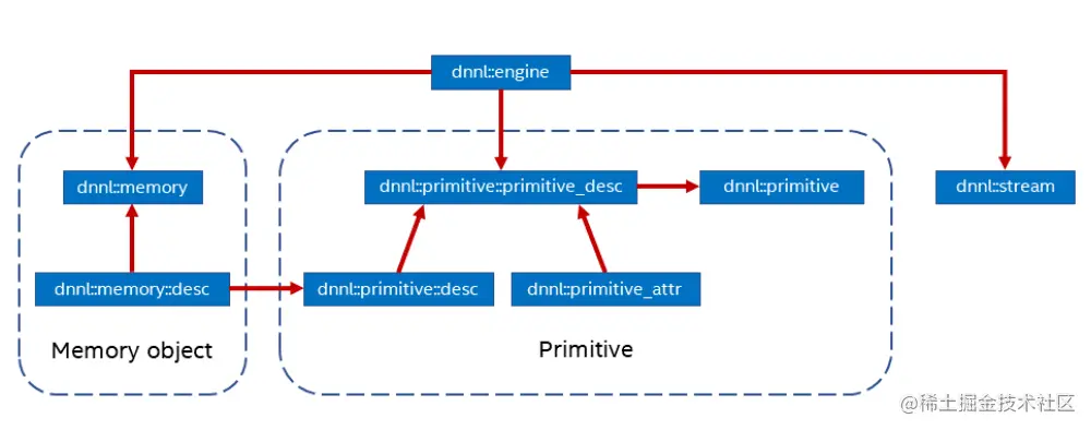 **1.原语(Primitive):**是一个封装了特定计算过程的函数对象,特定计算过程如前向卷积,LSTM 反向计算等。可以通过原语的属性来控制原语表达更复杂的融合操作,例如前向卷积和 ReLU 的融合。这里需要注意的是创建原语是重量级操作,最好的方式是一次创建、重复使用。或者可以通过缓存具有相同参数的原语来减少原语创建成本。