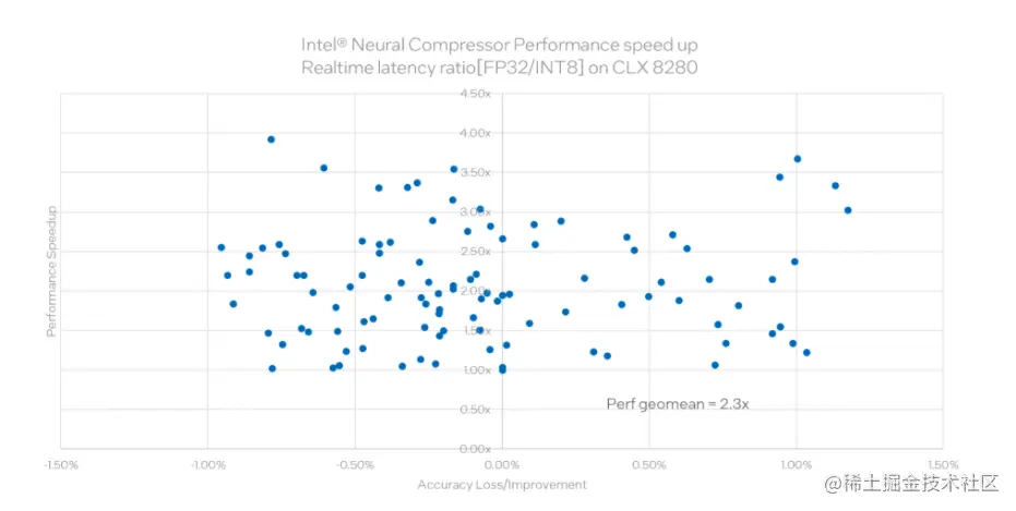 这是在 150+ 个业内常用的模型,使用 INC 工作后的评估结果。这些模型涉及各个领域,包括图像分类中常用的ResNet、GoogLeNet、Inception,目标检测中常用的Mobilenet、Yolo、Faster RCNN,推荐中常用的 Wide&deep、DLRM,自然语言处理中常用的 bert 等。这张图展现的是 int8 相对于fp32 的性能结果比较。横轴为相应的精度改变,纵轴为 Int8 与 fp32 相比在实时 latency 的提升。可以看到几何平均提升达到 2.3 倍。
