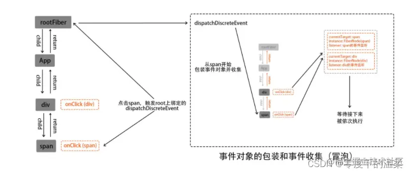 - 依据组件中写的事件名识别其属于哪个阶段的事件(冒泡或捕获),例如onClickCapture这样的React事件名称就代表是需要事件在捕获阶段触发,而onClick代表事件需要在冒泡阶段触发。