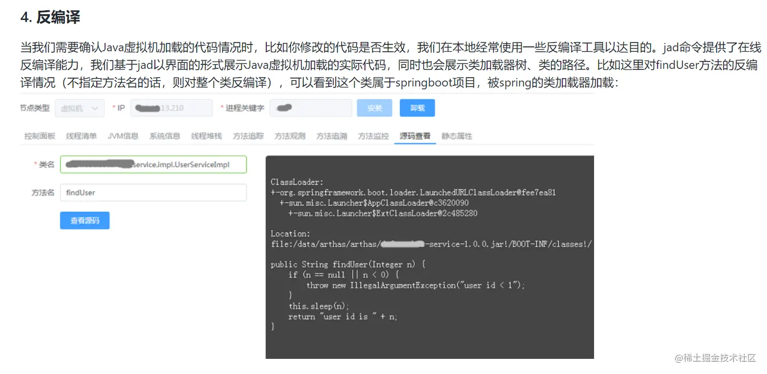 基于 Arthas 的功能,再次封装了一个 web UI 页面出来,藏在这个页面背后的接口,可以对执行结果进行剪裁和修改,处理成 json 格式数据返回给平台做展示。