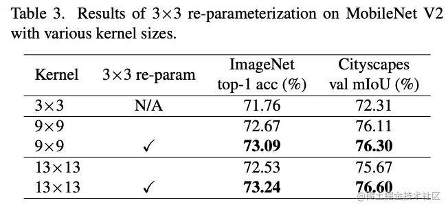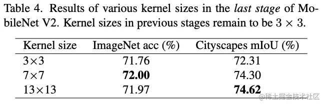 为了验证大卷积在小特征图上的有效性,将MobileNetV2最后的stage(特征图大小为7x7)的深度卷积分别扩大至7x7和13x13进行对比,实验结构附带了准则3建议的结构重参数。结果如表4所示,尽管特征图已经很小了,增大卷积核依然可以带来性能提升。