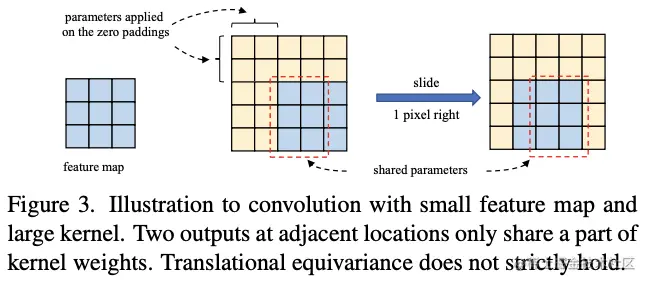 当小特征图上的卷积核变大时,卷积的平移不变性不再严格成立。如图3所示,两个相邻的输出关联了不同的卷积核权值。这刚好符合ViTs的理念,通过放宽对称的先验要求(如输出要用相同的卷积权值得到)来获得更大的识别能力。有趣的是,transformer中使用的2D相对位置编码(其它特征相对于当前特征的位置)也可认为是一个卷积核大小为的深度卷积,其中和分别为特征图的高和宽。所以,大卷积核不仅能够帮助学习特征间的相对位置信息,由于要添加较多padding,还编码了绝对位置信息(参考论文《On translation invariance in cnns: Convolutional layers can exploit absolute spatial location》)。