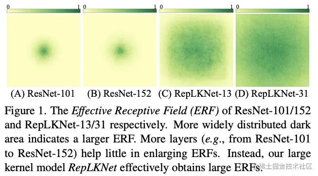 - 大卷积核能显著增加有效感受域(ERF),可包含更多的上下文信息,这对下游任务十分关键。
