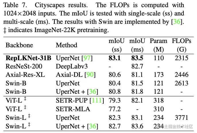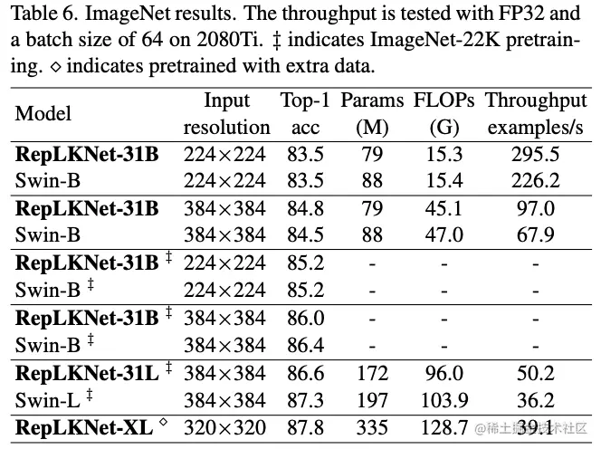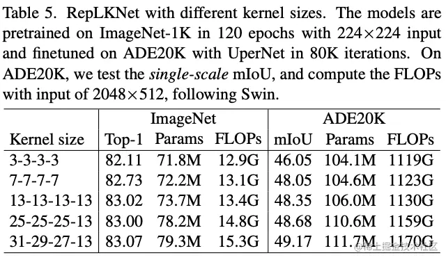 论文固定以及,简单调整提出了5个不同大小的网络,称为RepLKNet-3/7/13/25/31。在没有特殊调整训练配置情况下,各模型的参数和性能如表5所示。