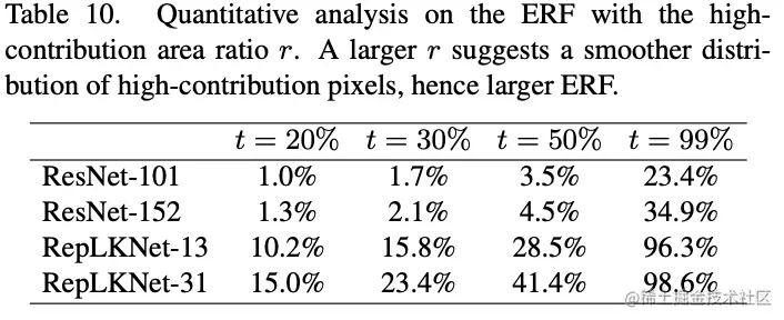 论文也对ResNet和RepLKNet的有效感受域进行可视化和统计,发现RepLkNet整体有效感受域要大于ResNet。