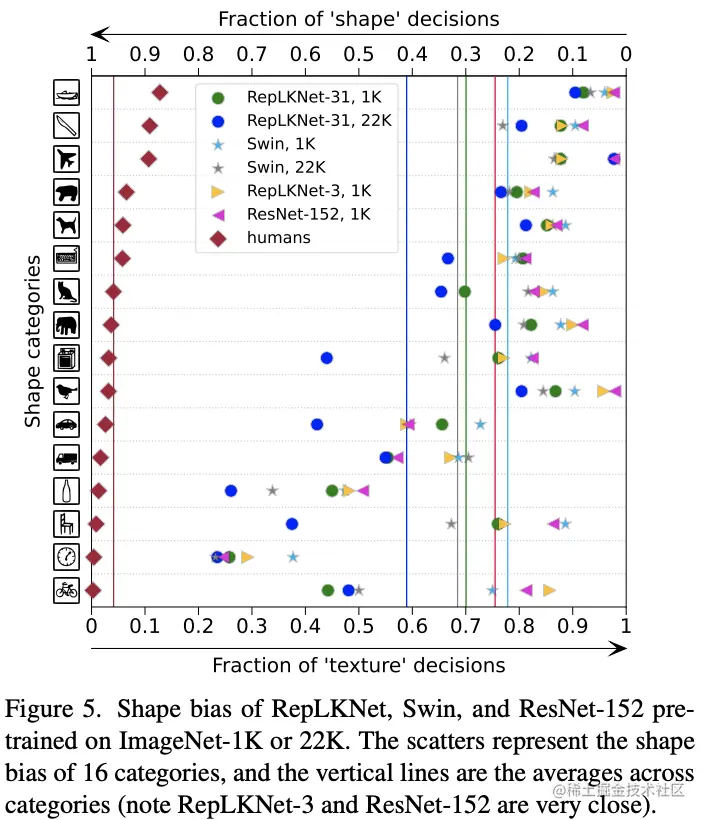 - 大卷积能引导网络倾向于学习更多形状特征。图像分类仅需要上下文或形状信息,而目标识别则非常需要形状信息。所以,倾向于更多形状特征的模型显然更适合下游任务。ViTs之所以在下游任务中表现强劲,也是得益于其强大的形状特征提取能力。相反,ImageNet预训练的传统卷积网络则倾向于上下文信息。