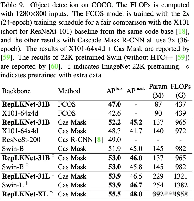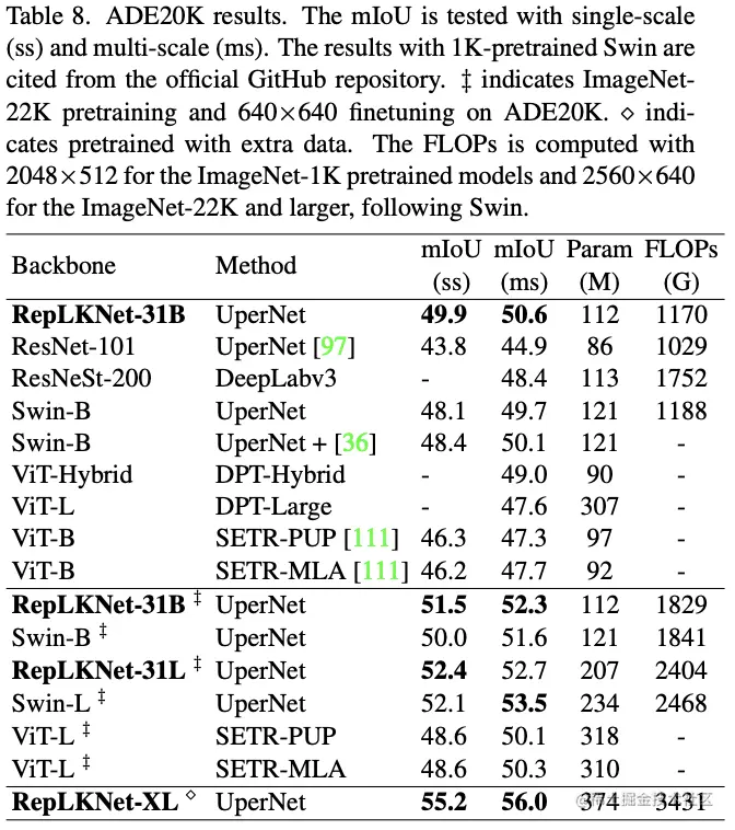 另外,论文还对训练配置进行细调以便于与SOTA模型对比,该模型称为RepLKNet-31B。在此基础上,调整超参数得到RepLKNet-31L。进一步调整超参数得到RepLKNet-31XL,该网络的RepLK Blocks的中间特征为输入的1.5倍。