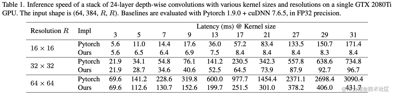 如表1所示,目前的深度学习框架对深度卷积的实现较为低效。为此,论文尝试了不同的方法来优化CUDA内核,最后选择了block-wise(inverse) implicit gemm算法并集成到了MegEngine框架中。相对于Pytorch,深度卷积带来的计算延迟从49.5%降低到了12.3%,几乎与计算量成正比。