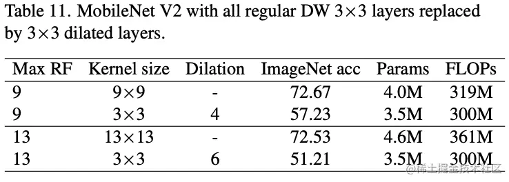 空洞卷积是一个常用的扩大卷积范围的方法,所以论文对空洞深度卷积和普通深度卷积进行了对比。如表11所示,尽管最大感受域可能一样,但空洞深度卷积的表达能力要弱很多,准确率下降非常明显。这也是符合预期的,虽然空洞卷积的感受域较大,但其计算用的特征非常少。