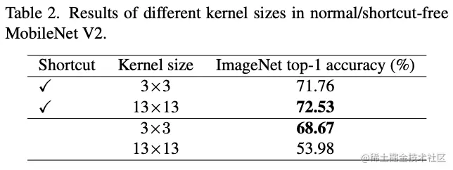为了验证短路连接对大卷积核的重要性,论文以MobileNetV2作为基准,替换其中的深度卷积核大小来进行有无短路连接的对比。如表2所示,在有短路连接的情况下,大卷积核能带来0.77%的性能提升。而没短路连接的情况下,大卷积核的准确率降低至53.98%。
