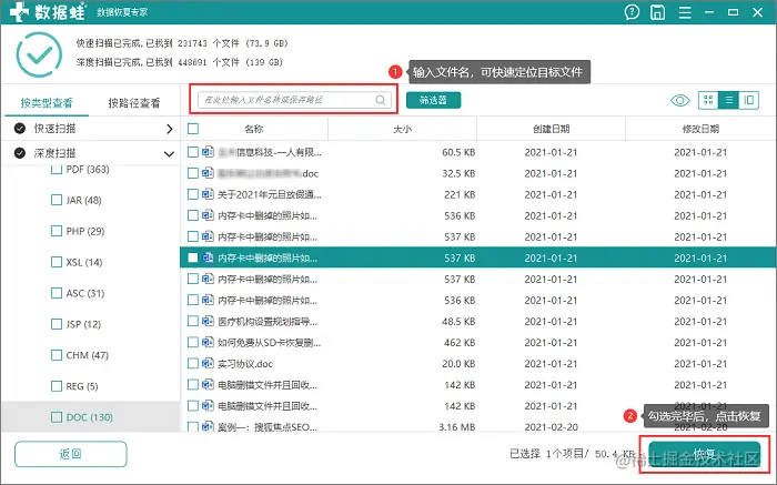 第2步:扫描完成后,在扫描出来的结果中寻找自己删除或者丢失的文件。知道文件类型或者名称的话可以在搜索框中查找,找到需要的文件后还能通过切换视图看一下它的大小等信息,最后只需要点击“恢复”就OK了!