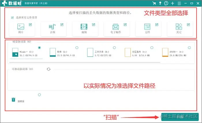 第1步:需要在电脑上打开数据蛙数据恢复专家,然后选择所有的文件类型,首次体验建议全选;文件位置我们即是以实际情况为准;这两个部分选择完成后开始“扫描”;