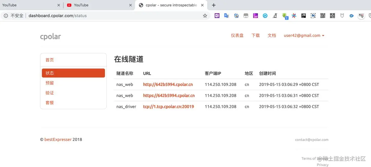 可以看到我们设置的两条数据隧道,都已经正常使用。也就说明我们将cpolar加入群晖NAS自启动列表的操作已经成功。