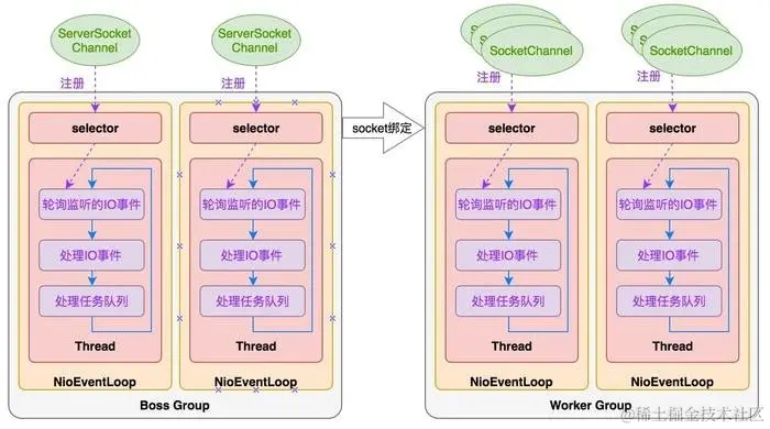 - 步骤 2 完成之后,业务层的链路正式建立,将 SocketChannel 从主线程池的 Reactor 线程的多路复用器上摘除,重新注册到 Sub 线程池的线程上,并创建一个 Handler 用于处理各种连接事件