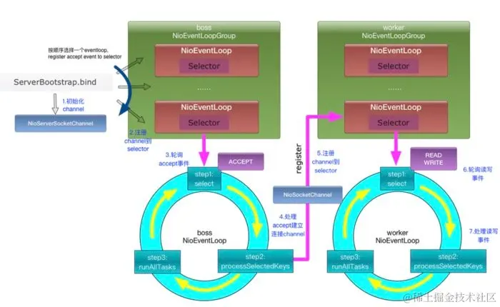 - 从主线程池中随机选择一个 Reactor 线程作为 acceptor 线程,用于绑定监听端口,接收客户端连接