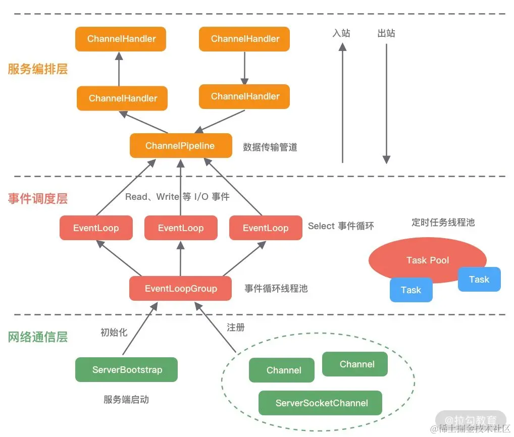 - Handler 通过 Read 读取数据后,会分发给后面的 Worker 线程池进行业务处理