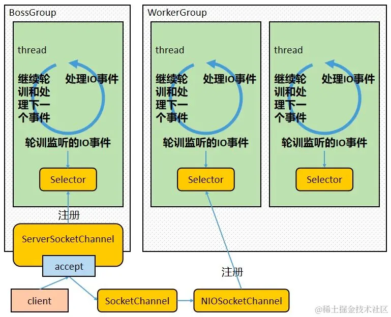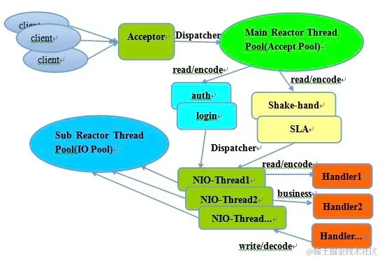 - acceptor 线程接收客户端连接请求之后创建新的 SocketChannel,将其注册到主线程池的其它 Reactor 线程上,由其负责接入认证、IP 黑白名单过滤、握手等操作