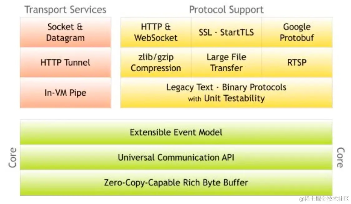 - 虽然 JAVA NIO 和 JAVA AIO 框架提供了 多路复用 IO/异步 IO 的支持,但是并没有提供上层“信息格式”的良好封装。例如前两者并没有提供针对 Protocol Buffer、JSON 这些信息格式的封装,但是 Netty 框架提供了这些数据格式封装(基于责任链模式的编码和解码功能)