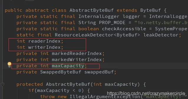 这三个指针,是三个 int 型的成员属性,定义在 AbstractByteBuf 抽象基类中。三个指针的代码截图,如下: