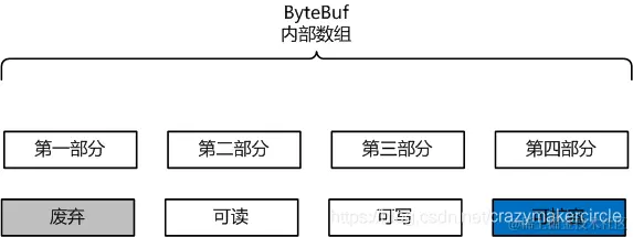 ByteBuf 是一个字节容器,内部是一个字节数组。从逻辑上来分,字节容器内部,可以分为四个部分: