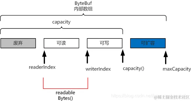 - 第二部分是可读字节,这部分数据是 ByteBuf 的主体数据, 从 ByteBuf 里面读取的数据都来自这一部分;